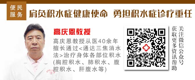 积水科主任医师——消水法治疗身体各部位积水(胸腔积水、肺积水、腹腔积水、肝腹水),采用《消水法》,“三焦者,水谷之道路,气之所始终也。若三焦气塞,脉道壅闭,则水积为饮,不得宣行,聚成痰饮”。人体水液的输布排泄,主要依靠三焦的气化作用和肺、脾、肾的功能活动,气化则水行。通过此方法患者体液得到正常的输布和排泄,强心开肺宣发肃降通调水道,充分发挥中医药优势重新调动人体自身机能,使积水从大、小便自然排出体外。从根本上解决了积水不断复发中、西医临床难题。